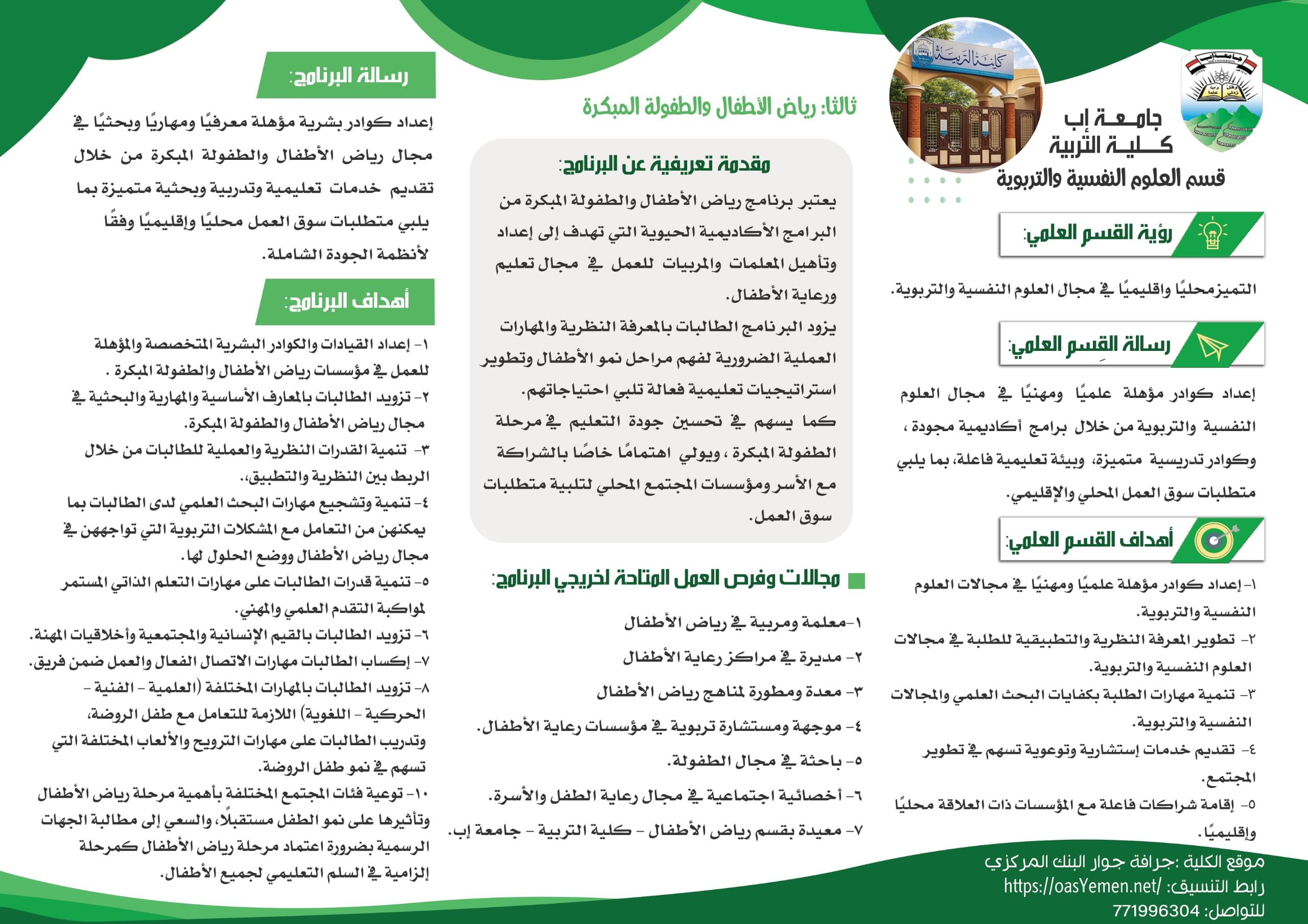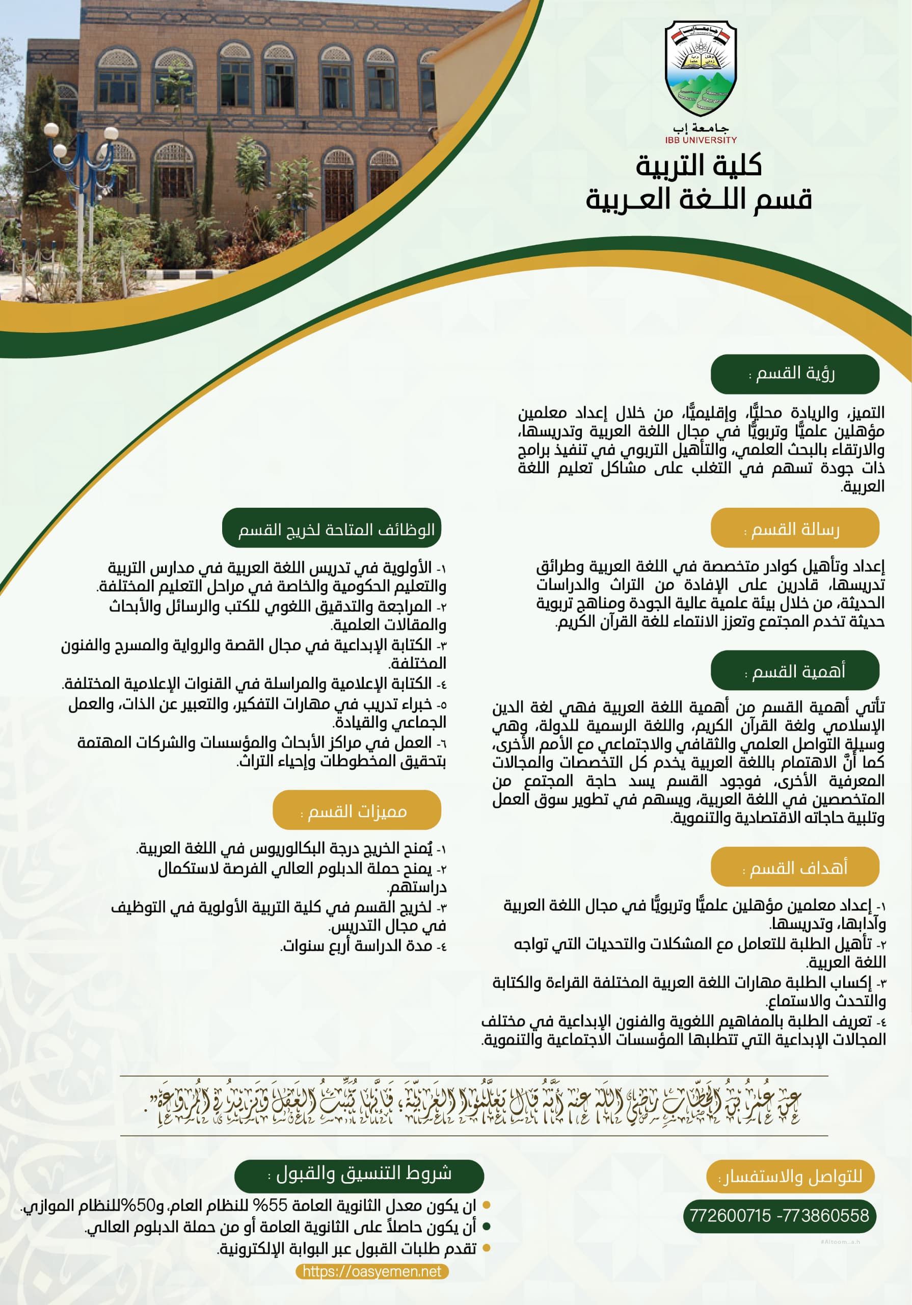 تسعى كلية التربية بجامعة إب إلى إعداد كوادر تربوية وبحثية ذات كفاءة مهنية عالية لتلبية احتياجات المجتمع من خلال برامج تعليمية مجودة وبيئة أكاديمية وإدارية فاعلة.