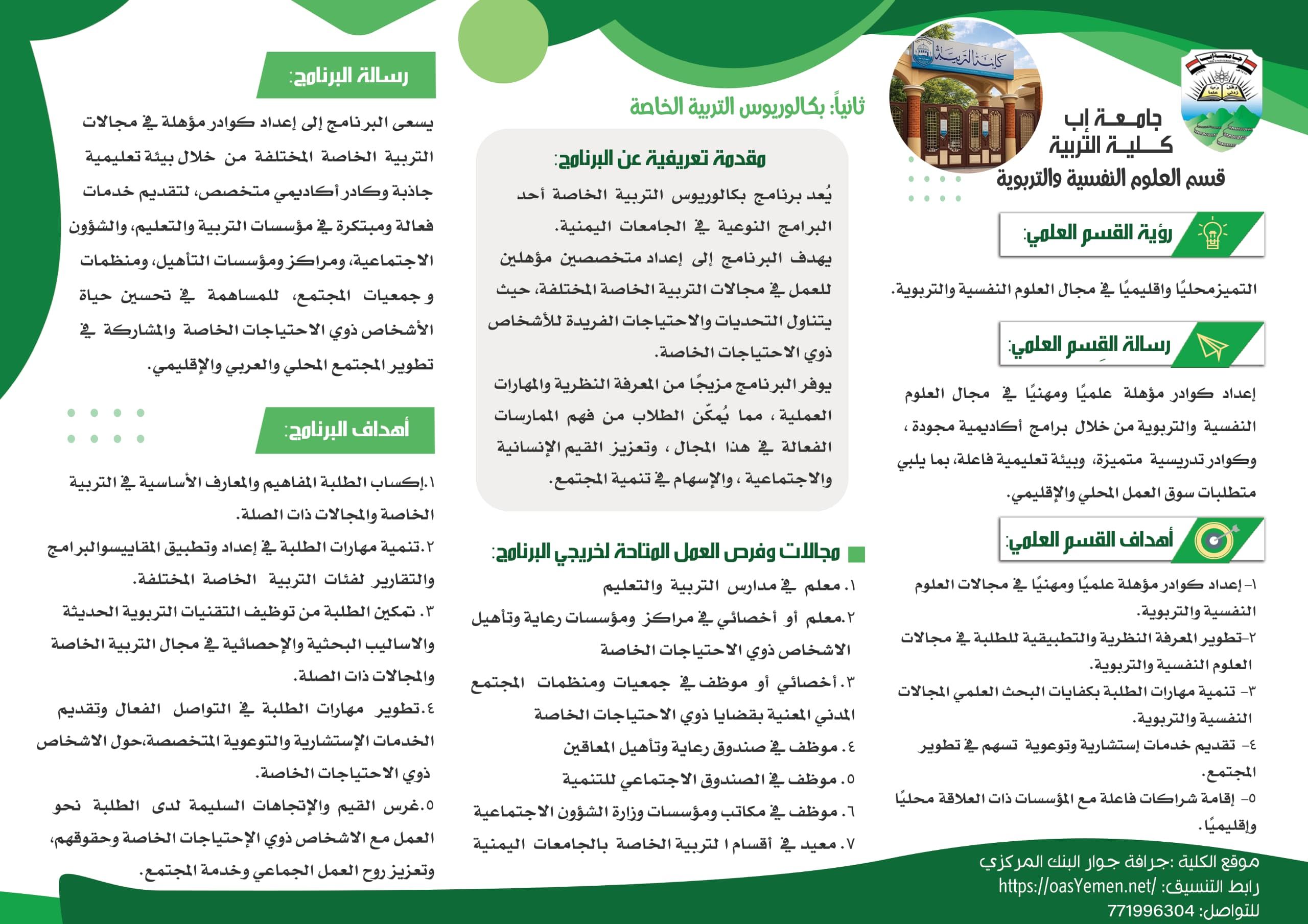 تتطلع كلية التربية بجامعة إب إلى التميّز في إعداد القيادات التربوية والكوادر البحثية بما يلبي احتياجات المجتمع ويحقق معايير الجودة الوطنية.