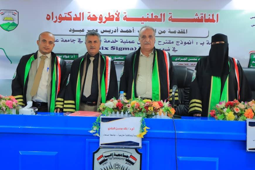 أقيمت بجامعة إب المناقشة العلنية لأطروحة الدكتوراه المقدمة من الباحث أحمد عبود والموسومة ب " أنموذج...