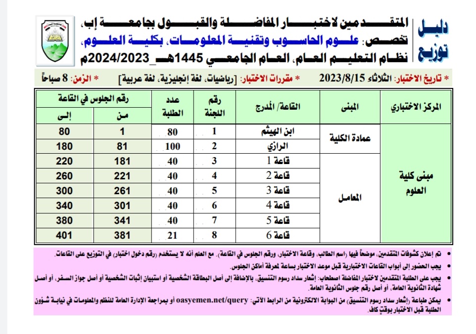 دليل توزيع المتقدمين لإختبارات المفاضلة لقسم علوم الحاسوب وتقنية المعلومات بكلية العلوم التطبيقية بجامعة إب .