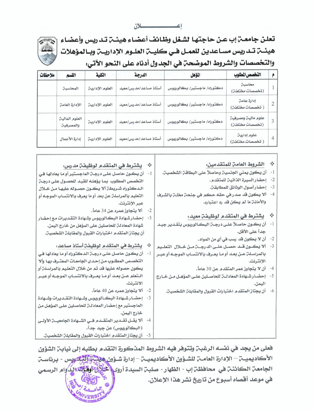 إعلان شغل وظائف أكاديمية بكلية العلوم الإدارية بجامعة إب