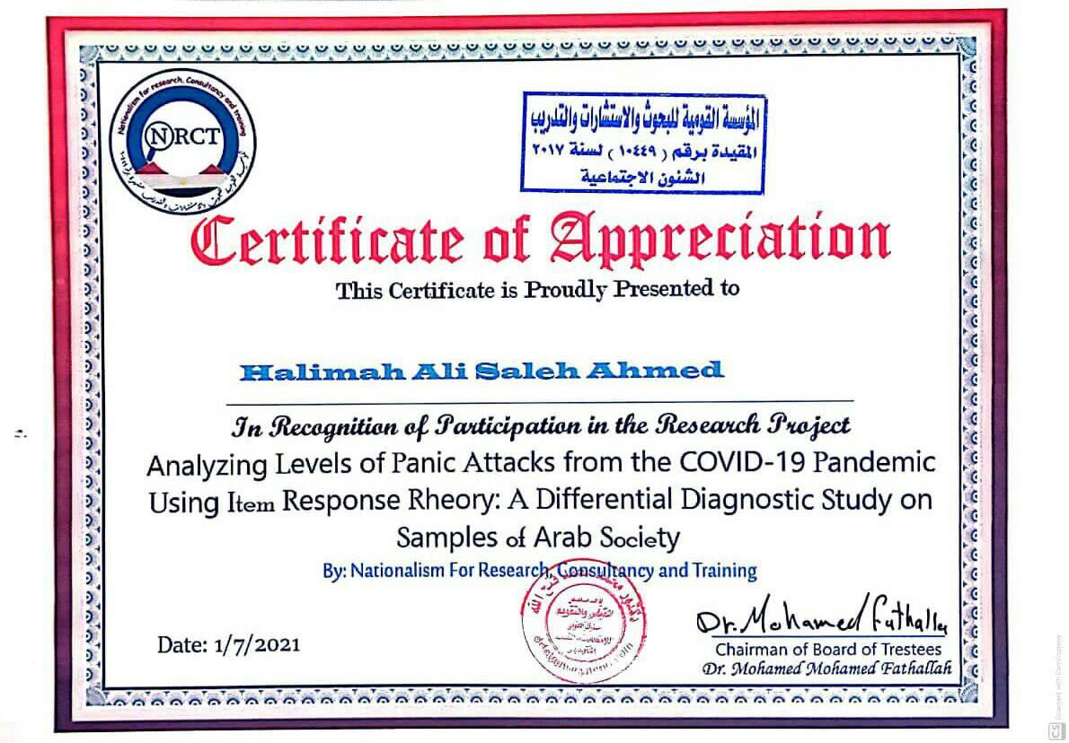 التشارك بدراسة دولية في إدارة اضطرابات الهلع وتحليل مستوياتها جراء جائحة كورونا COVID-19 في الوطن العربي