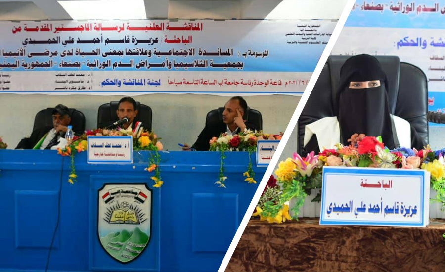 أقيمت في جامعة إب - قاعة الوحدة بمبنى رئاسة الجامعة - المناقشة العلنية لرسالة الماجستير المقدمة من الباحثة/ عزيزة قاسم أحمد علي الحميدي ؛ والموسومة بـ (المساندة الإجتماعية...