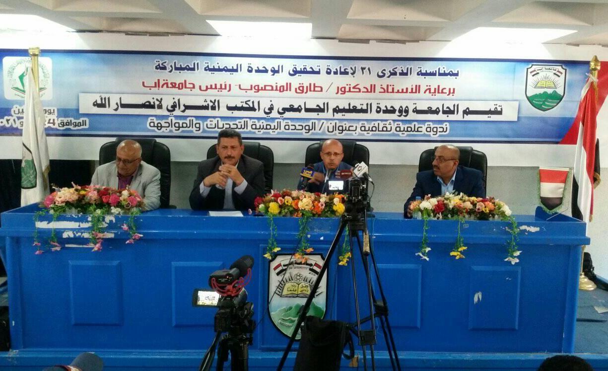 تزامنا مع إحتفالات بلادنا بأعياد الوحدة اليمنية المباركة أقامت جامعة إب ووحدة التعليم الجامعي ندوة بعنوان: الوحدة اليمنية - التحديات وسبل مواجهتها.