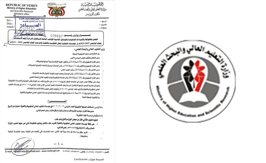 اصدر اليوم معالي الاستاذ حسين علي حازب وزير التعليم العالي والبحث العلمي القرار الوزاري رقم (37) لسنة 2020م بشأن العمل بالضوابط والإجراءات التنفيذية لاستئناف الدراسة وعقد الامتحانات في مؤسسات...