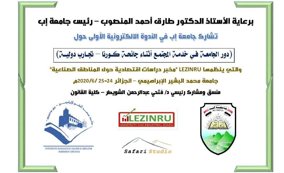 برعاية الأستاذ الدكتور طارق المنصوب رئيس الجامعة، تشارك جامعة إب في الندوة الإلكترونية الأولى حول: دور الجامعة في خدمة المجتمع أثناء جائحة كورونا - تجارب دولية
