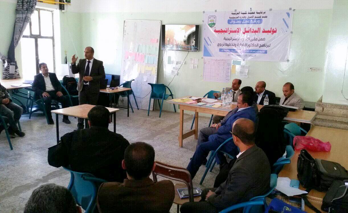 دشنت اليوم بكلية التربية بجامعة إب ورشة توليد البدائل الإستراتيجية ضمن أنشطة طلبة برنامج الدكتوراه في الإدارة والتخطيط التربوي.