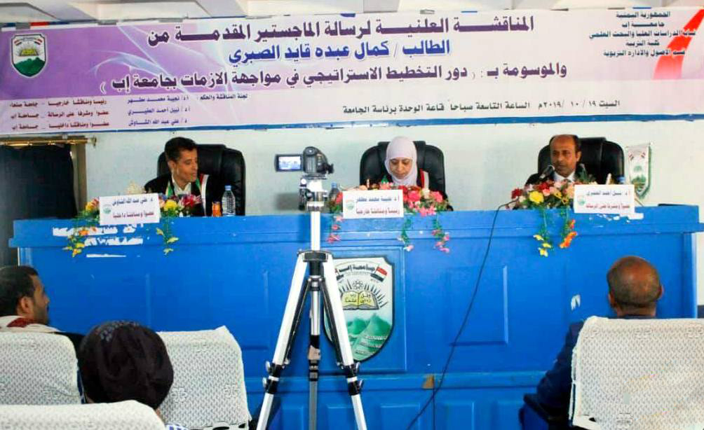 أقيمت في جامعة إب - قاعة الوحدة بمبنى رئاسة الجامعة - المناقشة العلنية لرسالة الماجستير المقدمة من الباحث/ كمال عبده قائد الصبري؛ والموسومة بـ (دور التخطيط الإستراتيجي في مواجهة...