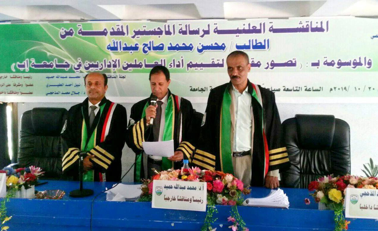 أقيمت في جامعة إب - قاعة الوحدة بمبنى رئاسة الجامعة - المناقشة العلنية لرسالة الماجستير المقدمة من الباحث/ محسن محمد صالح عبدالله؛ والموسومة بـ (تصور مقترح لتقييم أداء...