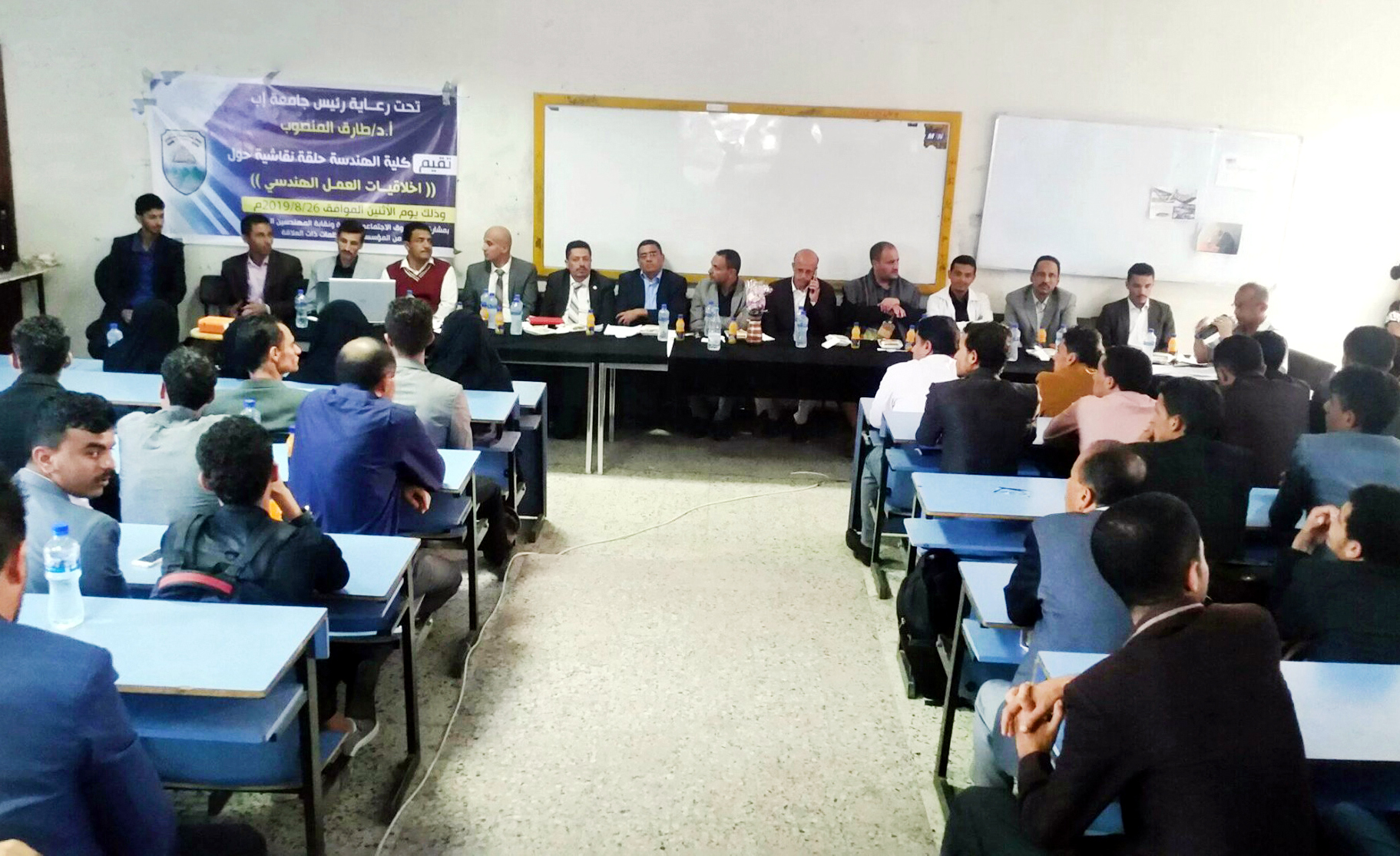 أقيمت اليوم بكلية الهندسة والعمارة حلقة نقاشية خاصة بإخلاقيات العمل الهندسي بمشاركة الصندوق الإجتماعي للتنمية ونقابة المهندسين اليمنيين وعدد من المنظمات والمؤسسات ذات العلاقة.