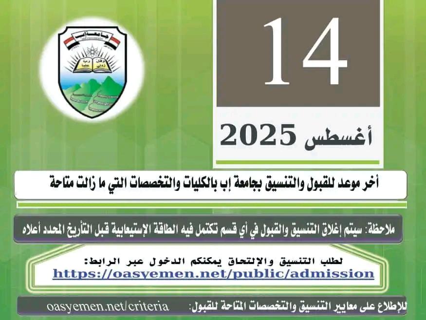 ? *بمناسبــة إعـــــلان نتائــــج الثانويــــة العامـــة للعـــــام الدراســــي: 1446هـ، 2024-2025م* *تهنئ جامعة إب جميع الطلبة خريجي الثانوية...